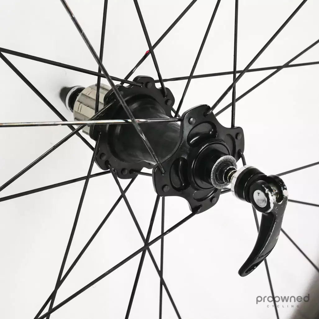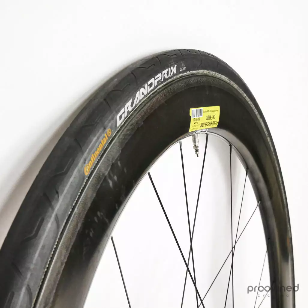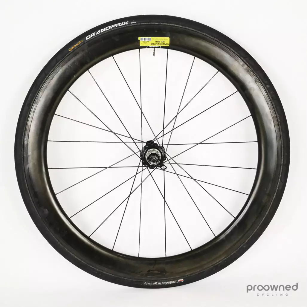 The wheel is used but only shows a few minor cosmetic scratches, nothing that affects the performance of the wheel. The wheel is equipped with a Continental GrandPrix 25c Clincher tire. The tire is used but still has many more miles left in them.