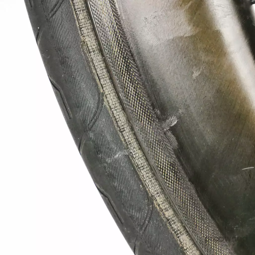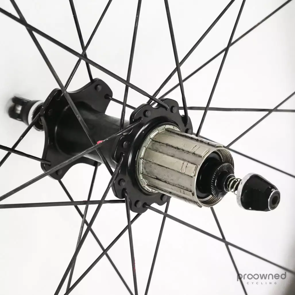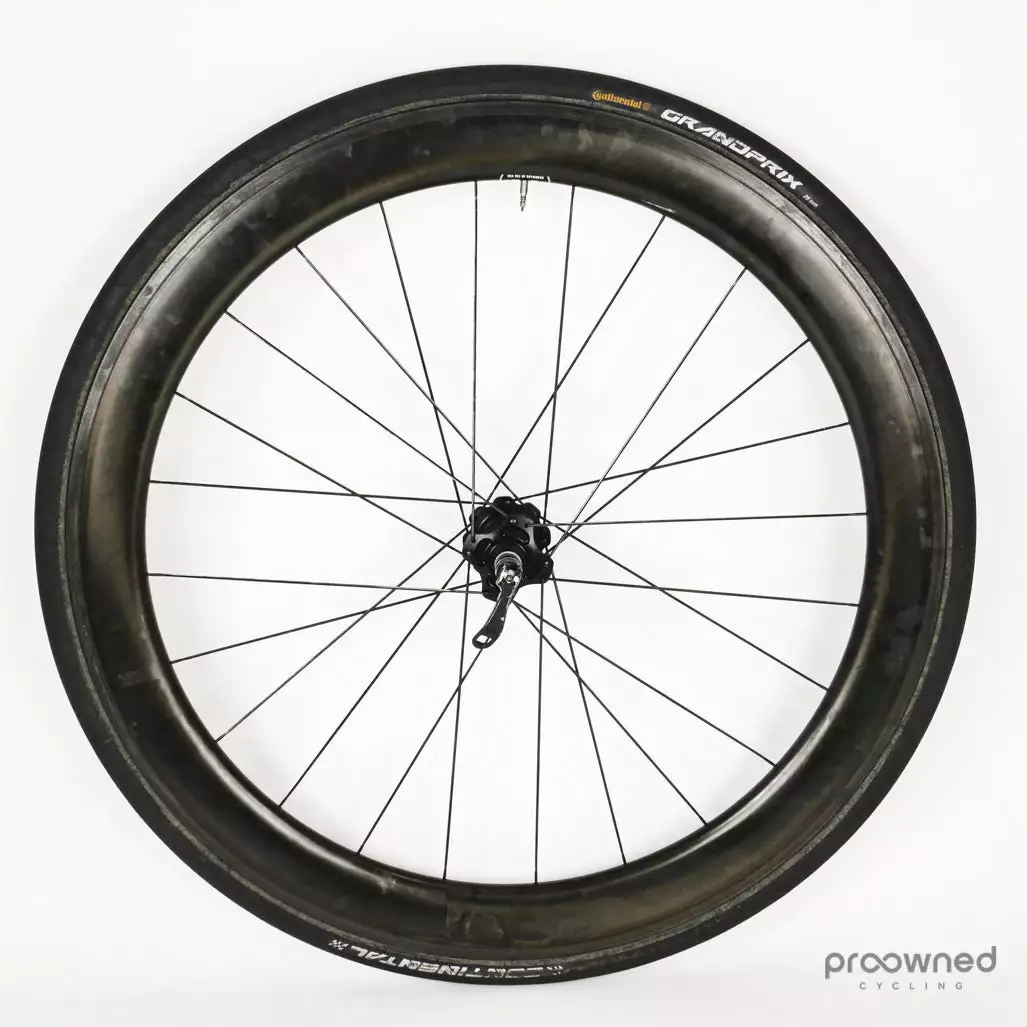 The wheel is used but only shows a few minor cosmetic scratches, nothing that affects the performance of the wheel. The wheel is equipped with a Continental GrandPrix 25c Clincher tire. The tire is used but still has many more miles left in them.
