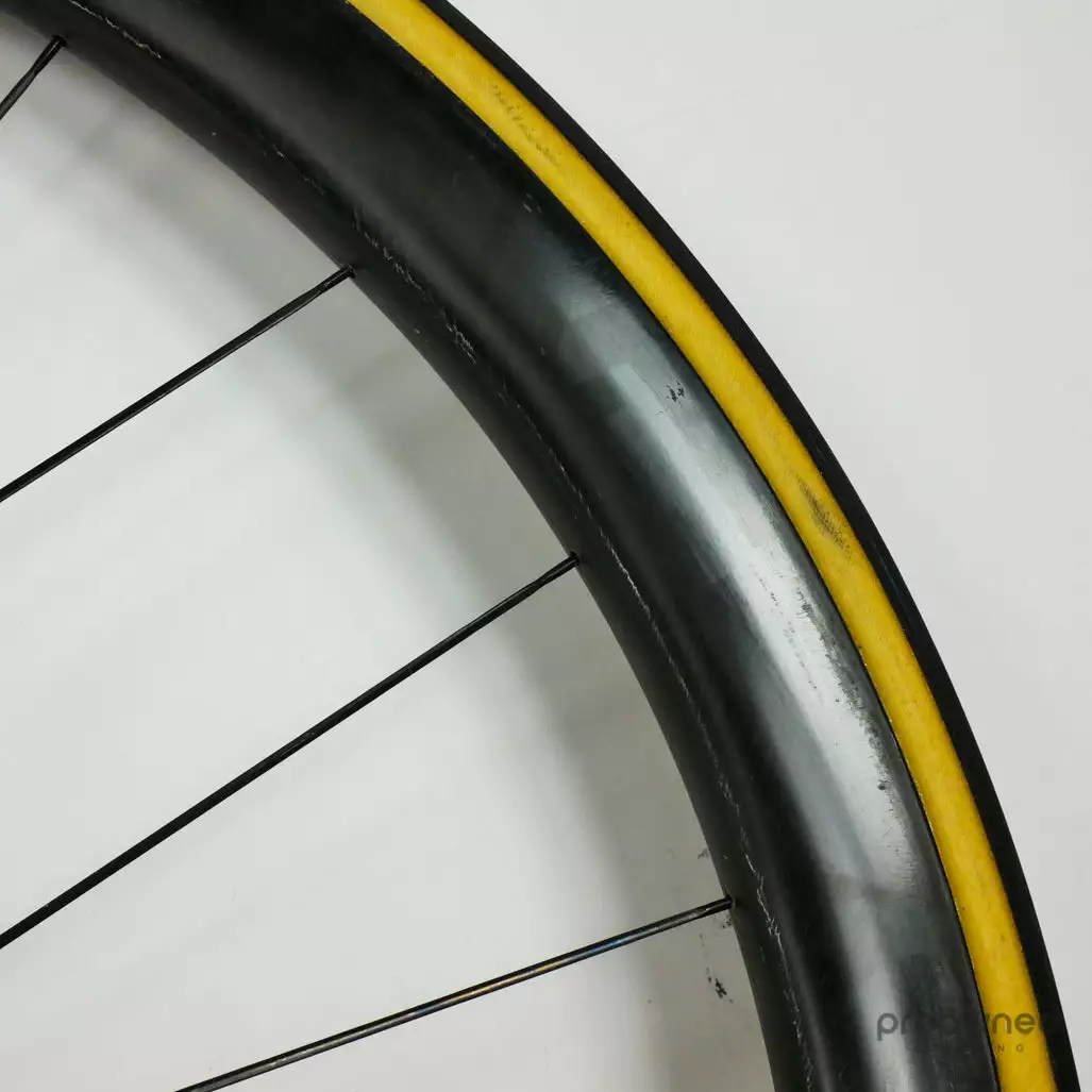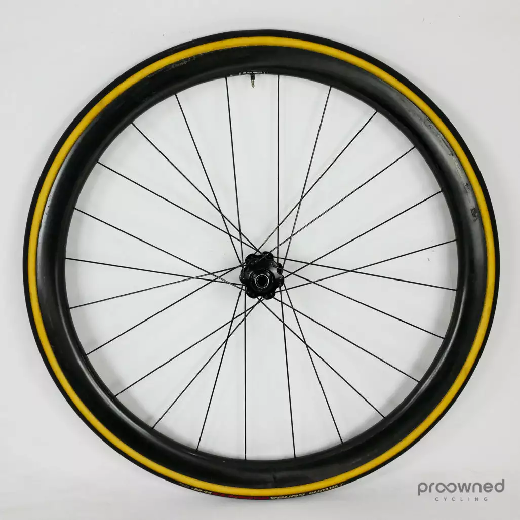 The wheel is equipped with Vittoria Corsa Graphene 2.0 tires. The tire is used but in good condition.