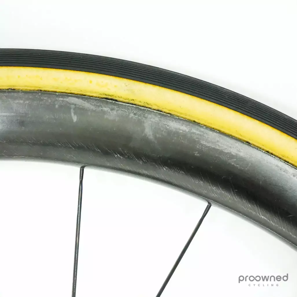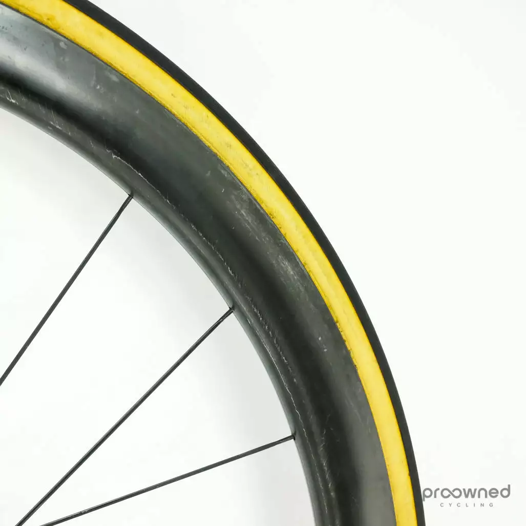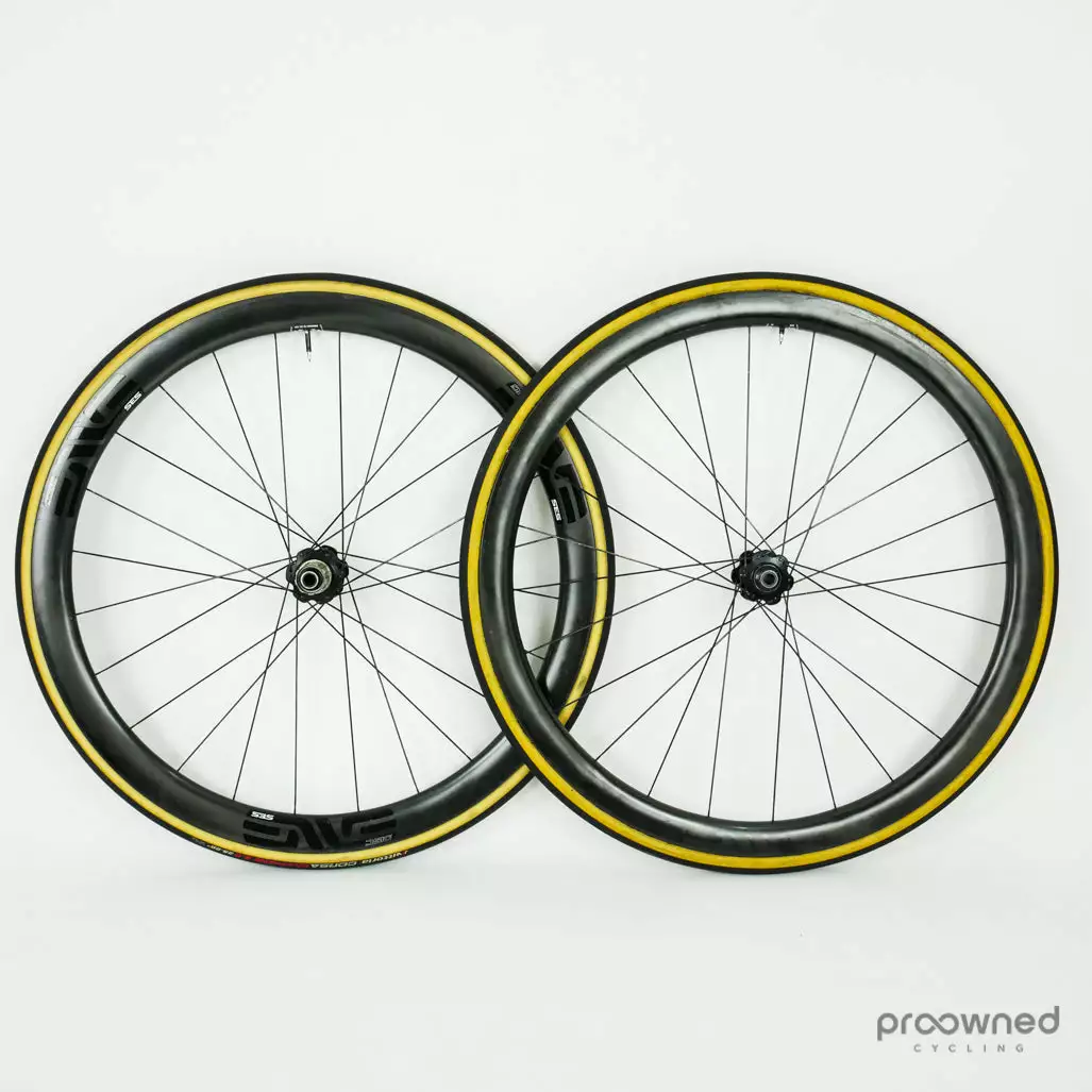 The wheelset has some cosmetic marks and scratches but nothing that affects the performance of the wheelset. The front wheel is without ENVE stickers and the rear wheel has black stickers. Bearings are running smoothly and the wheelset is overall in really good condition.