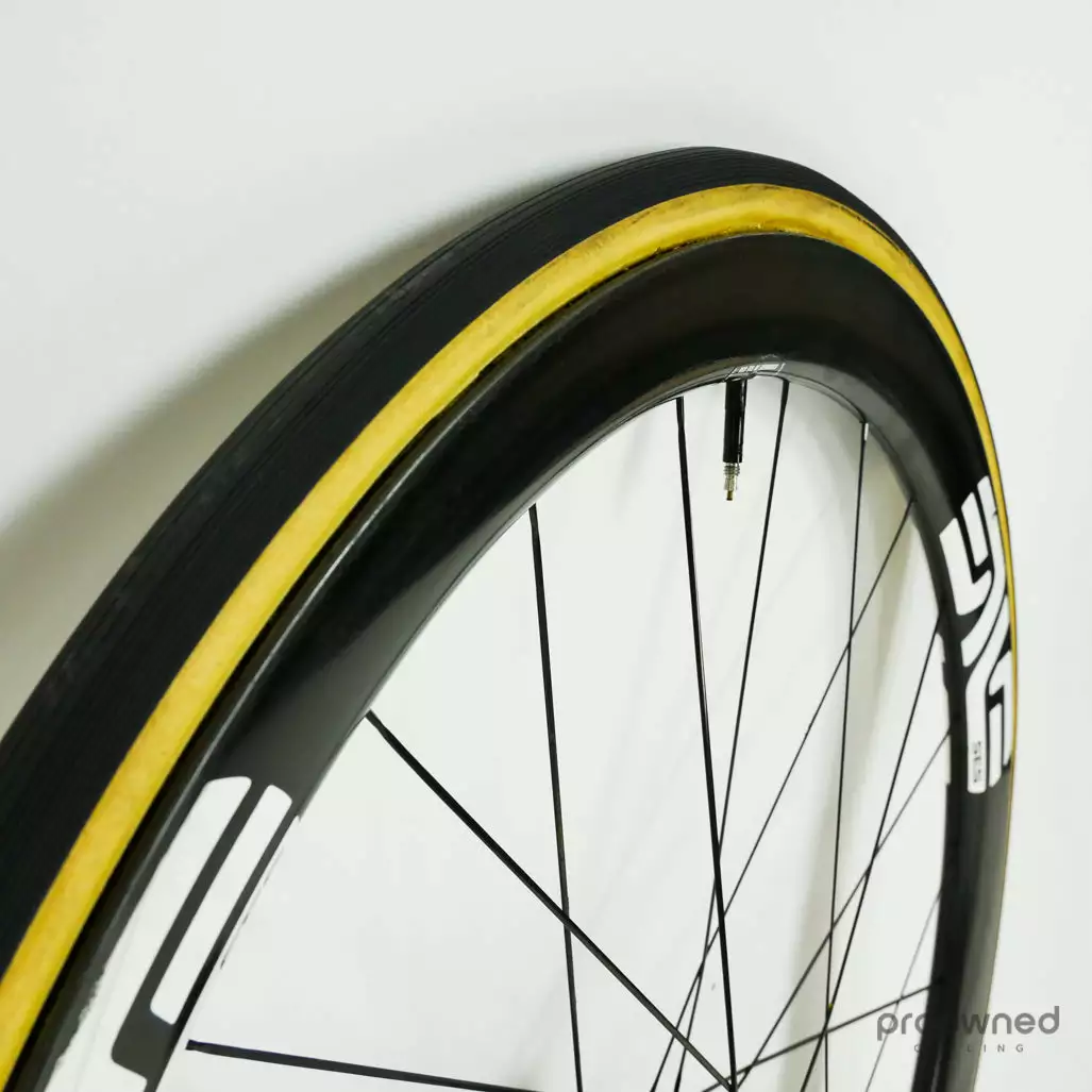 The wheels are equipped with a pair of Vittoria Corsa Graphene 2.0 tires. The tires are used but in good condition and are ready for many more miles of racing.