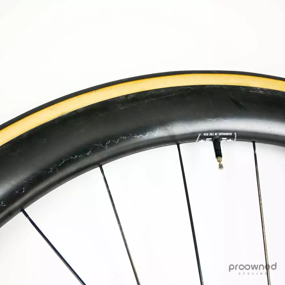 The tubular tire has been mounted and used but is in overall good condition.
