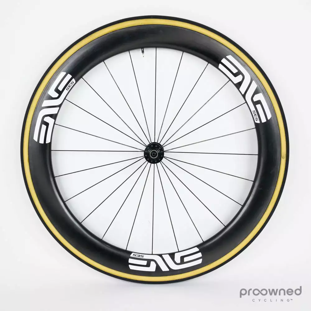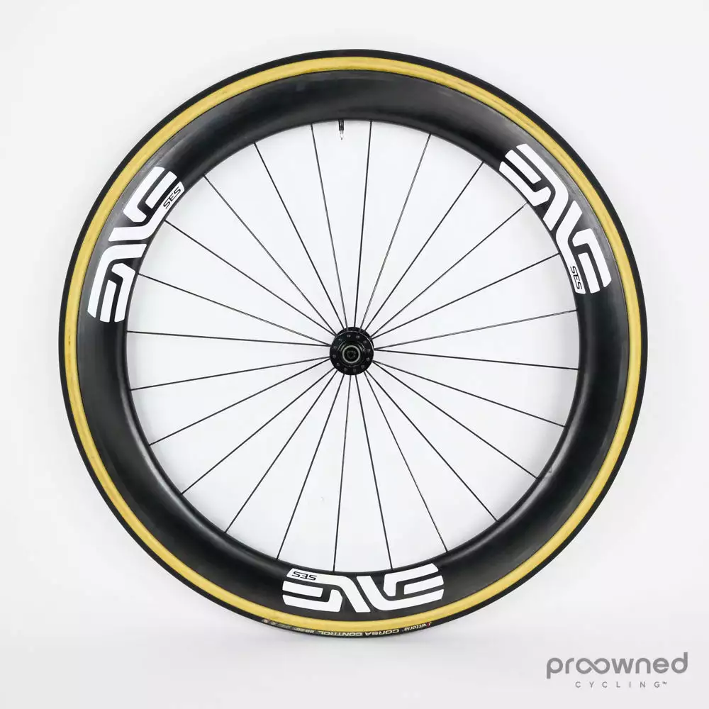 ENVE SES 5.6 tubular carbon fiber front wheel with DT Swiss 240 hubs.