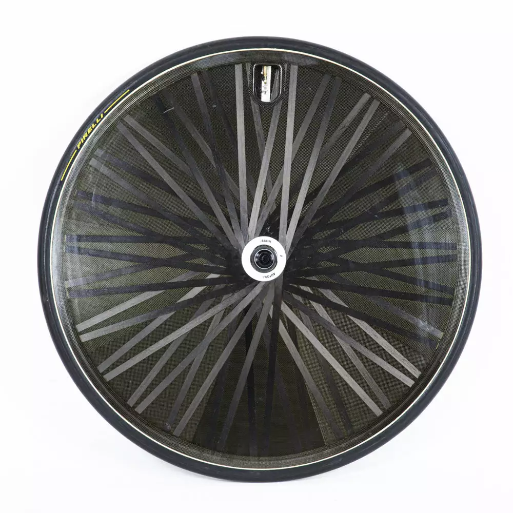 This wheel comes with a Pirelli P Zero Velo TT tubular tire mounted by the team mechanics. The race-ready lightweight tire is specially designed for time trial and has a completely smooth surface for optimal grip and minimal resistance. The P Zero Velo TT is a prototype tire made for World Tour teams.