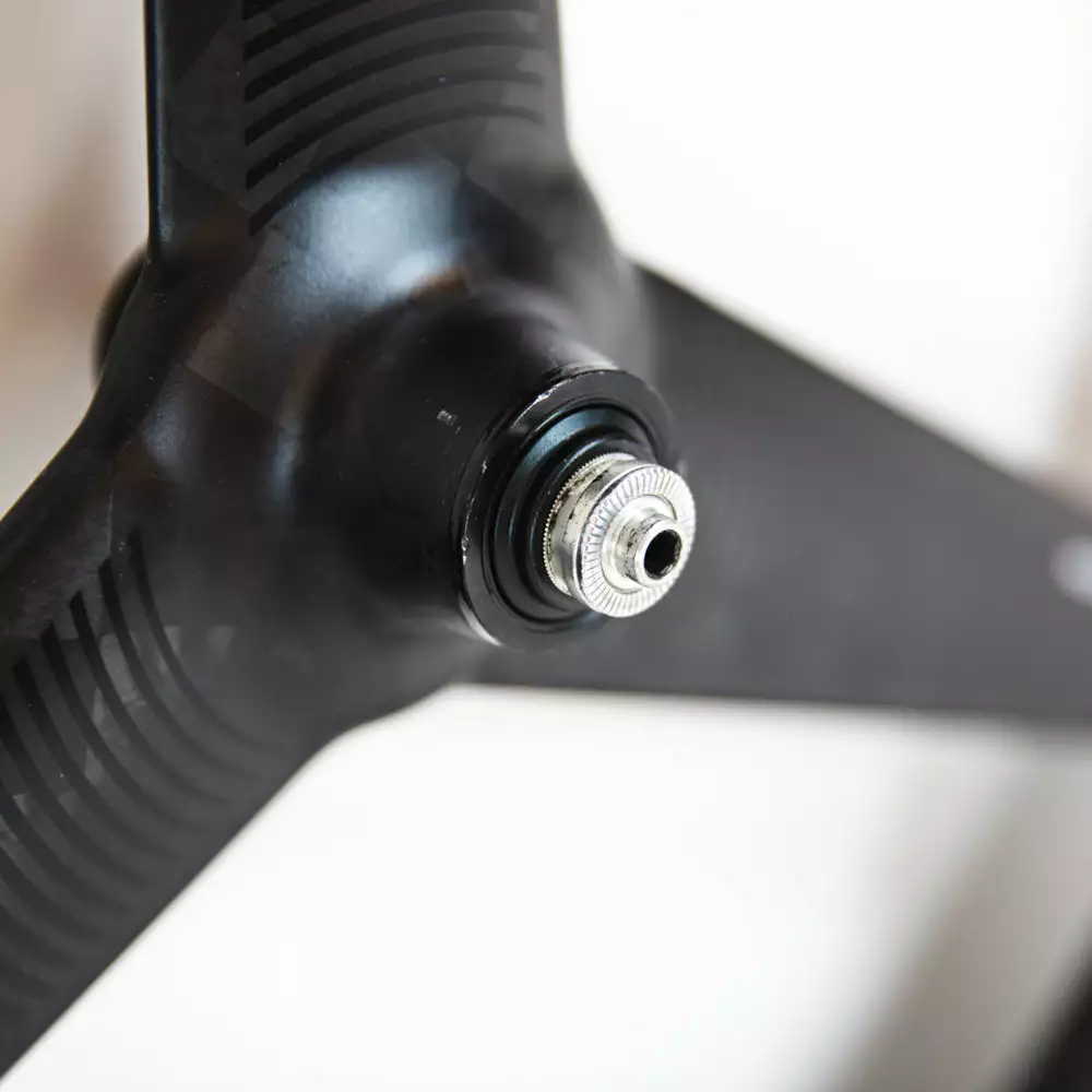 The wheel delivers reliable and smooth performance in varied conditions and can with great advantage be combined with a disc wheel, to complete an incredibly fast time trial machine. The spread tow carbon fibre construction not only looks awesome, but it is also extremely stiff and lightweight, ensuring a very low weight. The design provides minimal drag due to the 3-spoke profile, resulting in a phenomenal performance at high speeds. To prevent interrupting the airflow the valve is positioned behind one of the spokes.