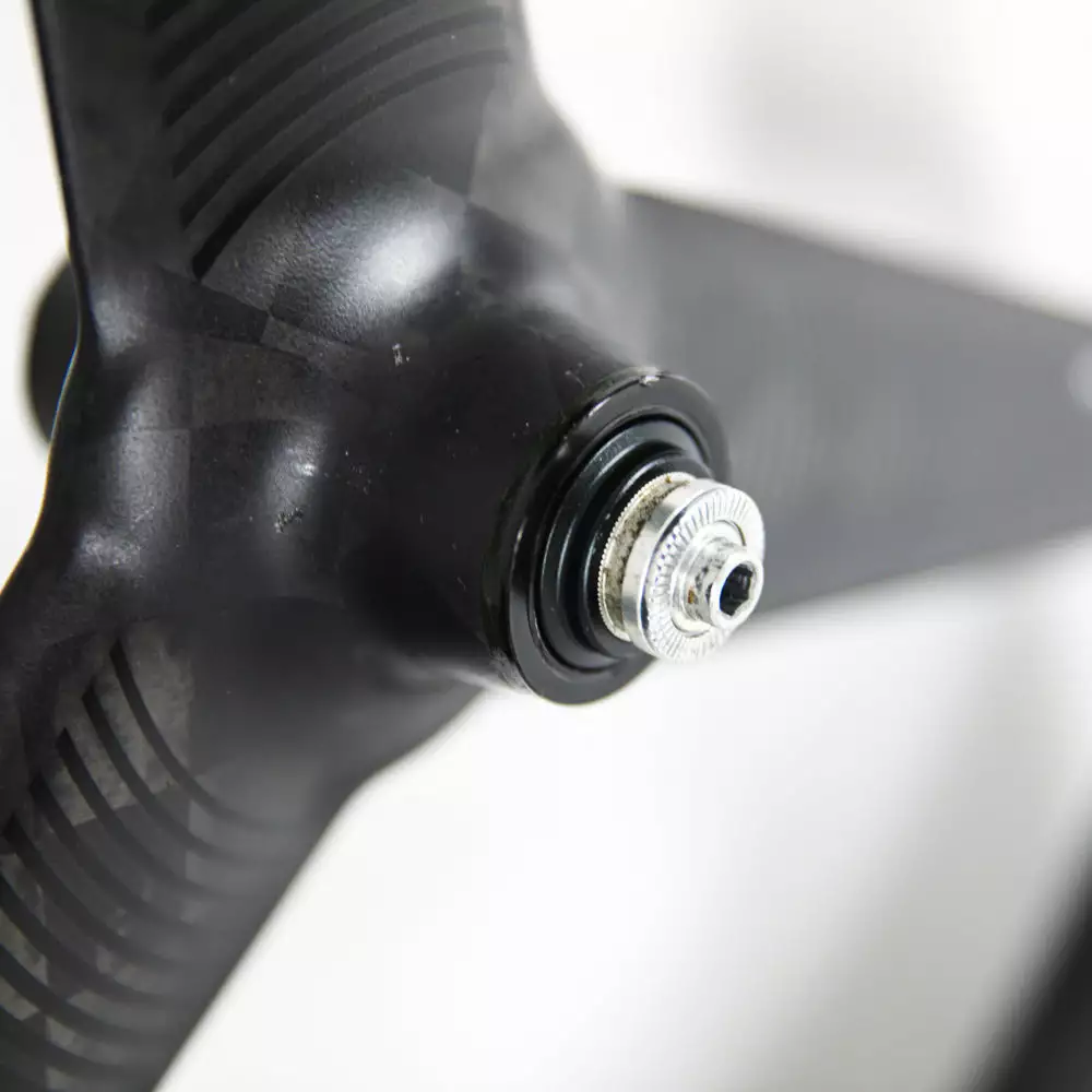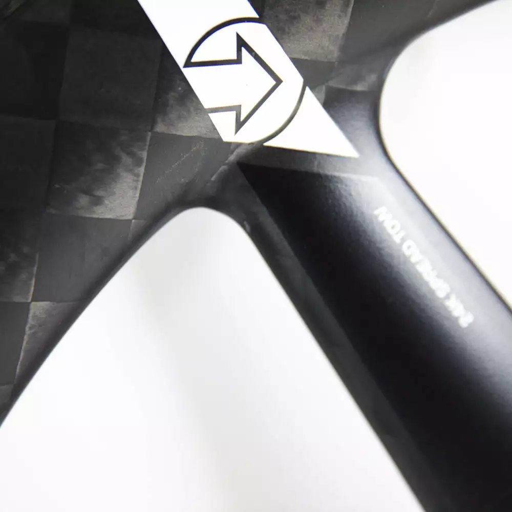 The wheel delivers reliable and smooth performance in varied conditions and can with great advantage be combined with a disc wheel, to complete an incredibly fast time trial machine. The spread tow carbon fibre construction not only looks awesome, but it is also extremely stiff and lightweight, ensuring a very low weight. The design provides minimal drag due to the 3-spoke profile, resulting in a phenomenal performance at high speeds. To prevent interrupting the airflow the valve is positioned behind one of the spokes.