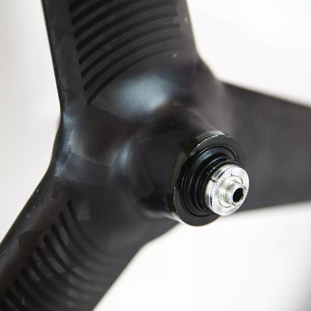 The wheel delivers reliable and smooth performance in varied conditions and can with great advantage be combined with a disc wheel, to complete an incredibly fast time trial machine. The spread tow carbon fibre construction not only looks awesome, but it is also extremely stiff and lightweight, ensuring a very low weight. The design provides minimal drag due to the 3-spoke profile, resulting in a phenomenal performance at high speeds. To prevent interrupting the airflow the valve is positioned behind one of the spokes.