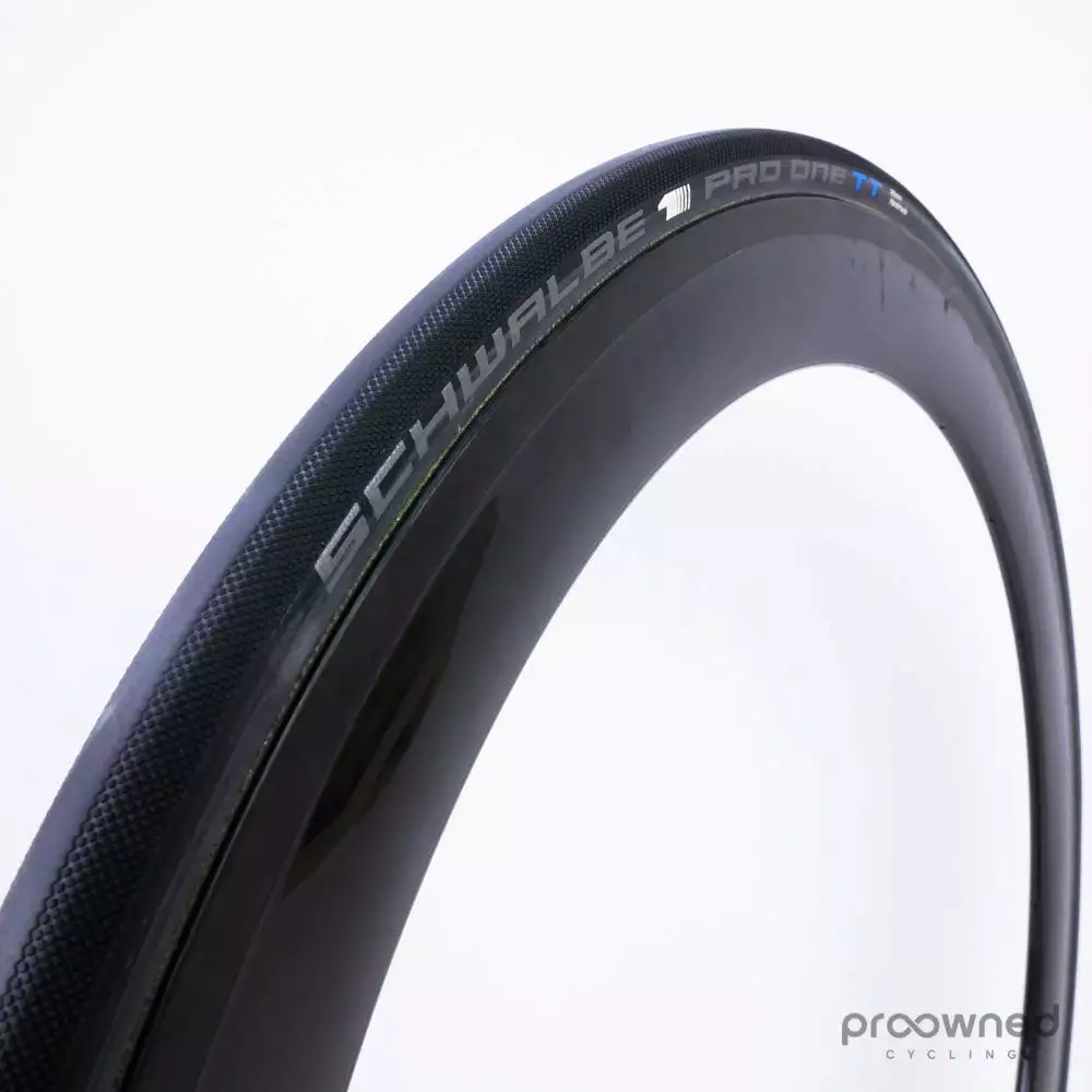 Brand new Schwalbe Pro One TT tubular tire. This is a special team issued version of Schwalbe’s popular One tubular tire, which is not found in the public shops. It is specifically made for use in Time Trials, and have a slick center of the thread for greater straight-line speed while keeping the ruffled surface on the sides for good grip in the corners too.