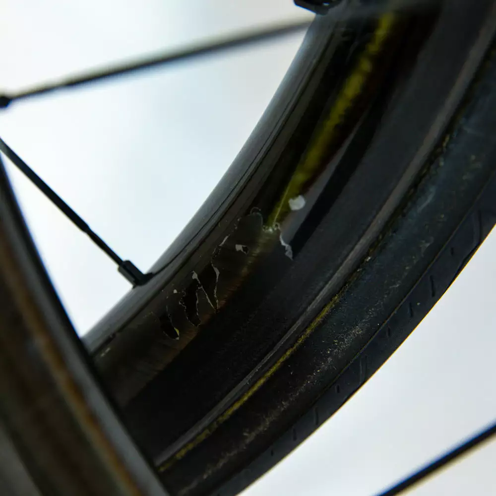 The wheelset is used. It comes with some marks from usage (mostly clearcoat). The wheels are in good condition with some scratches. The bearings are in good condition and there are many miles left in them. Both tires are used but in good condition.